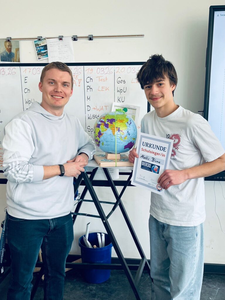 Als Preis erhielt der Schulsieger vom Förderverein ein kleines Geografie-Paket, bestehend aus dem Buch „Der Atlas für Neugierige“, einem aufblasbaren Globus sowie dem Kartenspiel „More or Less – Geografie“. Die Auswahl und Organisation, die von Herr Hubert übernommen wurde, soll die Beschäftigung mit geografischen Themen auf vielfältige und spielerische Weise unterstützen. Damit möchten wir die herausragende Leistung des Schulsiegers Matts Blume besonders würdigen und die Freude an geographischem Wissen weiter fördern.